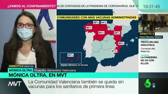 La vicepresidenta de la Generalitat Valenciana, Mónica Oltra, critica en Más Vale Tarde el reparto de las vacunas contra el coronavirus: "No tiene sentido que haya Comunidades Autónomas que las tengan en la nevera y que nosotros nos las estemos viendo y deseando para poner las segundas dosis".
