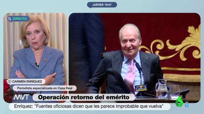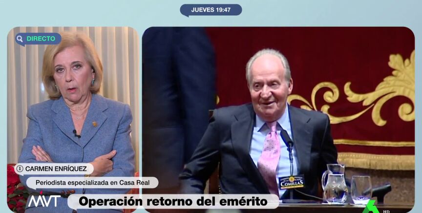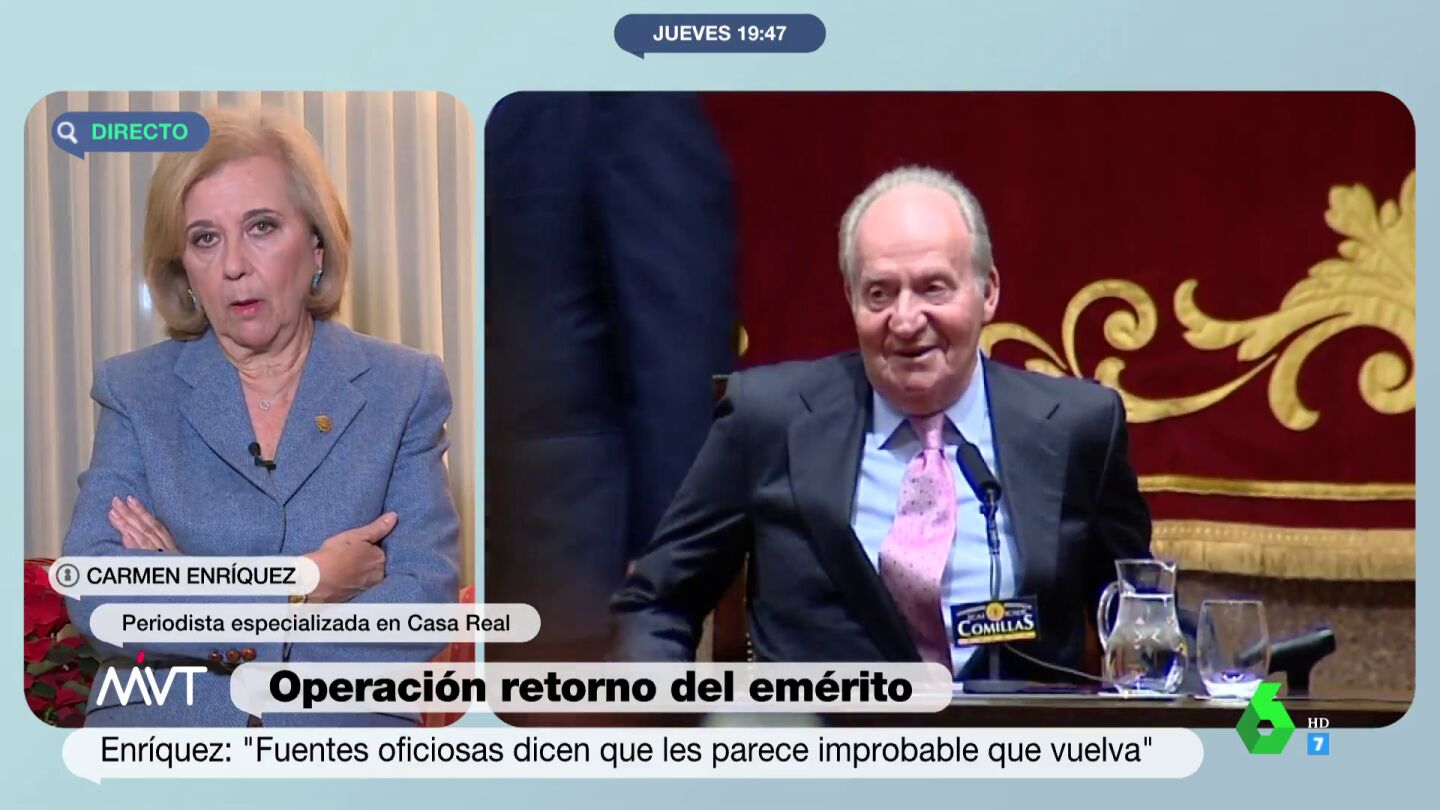 Carmen Enríquez asegura que es "improbable" que Juan Carlos I vuelva a España en Navidad o su cumpleaños. En MVT ha detallado cómo y cuándo podría ser este regreso.