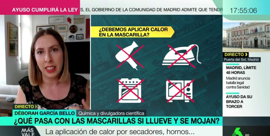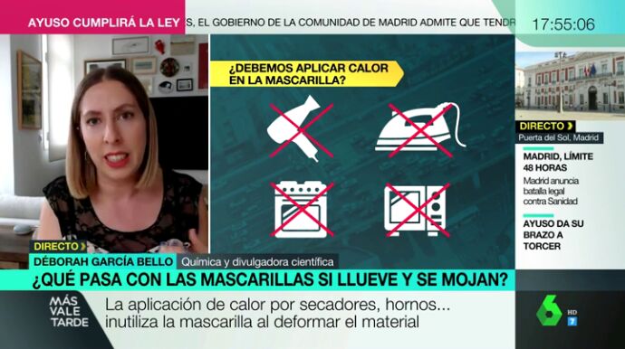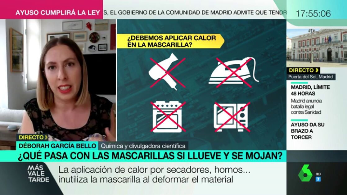 La divulgadora Déborah García Bello advierte de que, si se moja, la mascarilla deja de funcionar y hay que cambiarla por otra. Tampoco vale intentar secarla con una plancha o secador, ya que con el calor pierde efectividad.