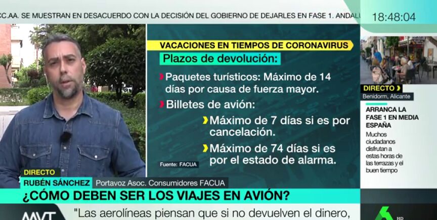 El portavoz de la Asociación de Consumidores FACUA, Rubén Sánchez, ha asegurado en Más Vale Tarde que hay muchísimos casos de reclamaciones de clientes que no han podido disfrutar de sus vuelos que aún no han recibido una recompensa.