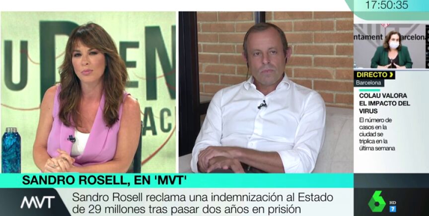 Sandro Rosell, expresidente del Fútbol Club Barcelona, ha reclamado una indemnización al Estado de 29 millones de euros tras pasar dos años en prisión. Sobre esta cuestión le ha preguntado Mamen Mendizábal en Más Vale Tarde, donde el exdirigente deportivo ha dicho, sobre la cifra que ha exigido: "Hay que poner un valor, pero la muerte en vida de dos años no tiene precio".