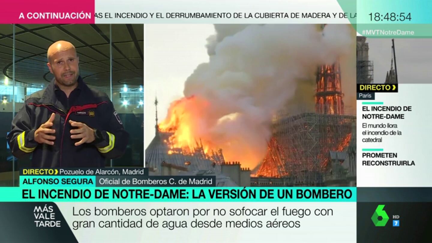 "Estamos seguros de que el cuerpo de bomberos de Francia hará una valoración técnica y completará la extinción del incendio para salvaguardar el edificio y sus alrededores", asegura Alfonso Segura, oficial de Bomberos de la Comunidad de Madrid.