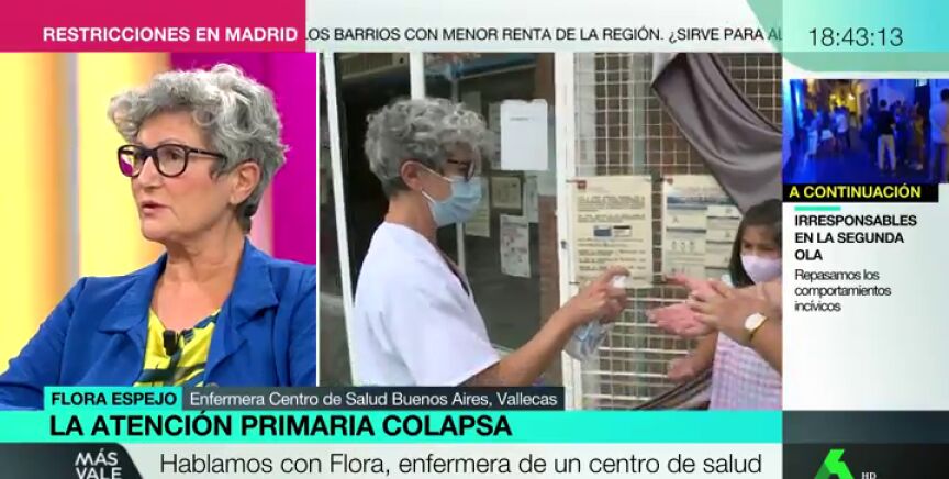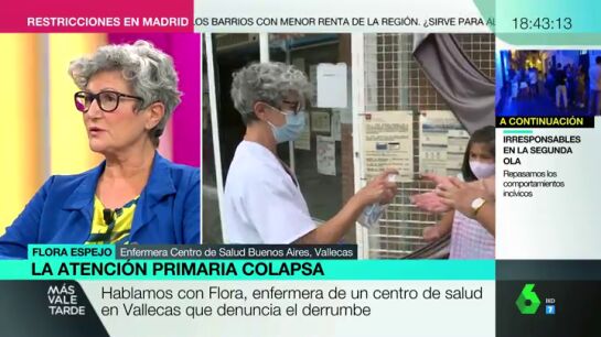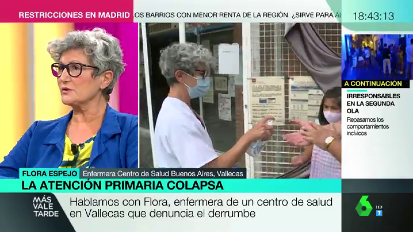 Madrid ha iniciado este lunes 14 días de restricciones en 37 zonas de la comunidad, que afectan especialmente a distritos del sur de la capital. Flora Espejo, enfermera del Centro de Salud de Buenos Aires, en el barrio de Vallecas, ha explicado en Más Vale Tarde que a pesar de las nuevas medidas la atención primaria "sigue sin profesionales".