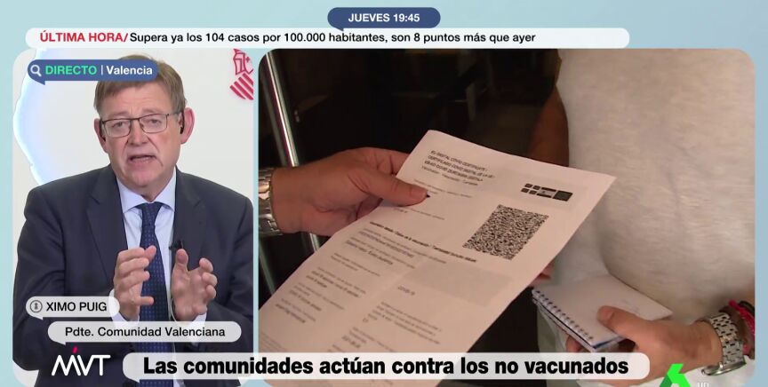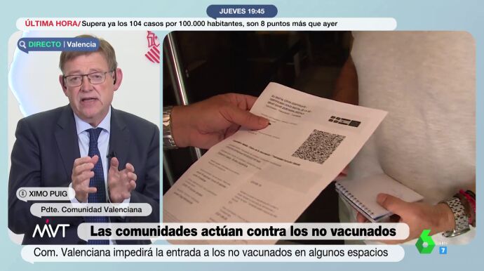 El presidente de la Comunidad Valenciana avanza que su intención es que se necesite el certificado COVID-19 para acceder a algunos lugares. "Hay que hacer todo lo posible para garantizar al máximo la seguridad", ha declarado en MVT.