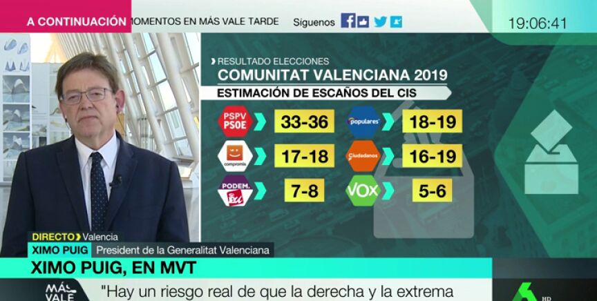 Ximo Puig, presidente de la Generalitat Valenciana, explica que las encuestas del CIS "son tendencias y fotos del momento", pero reconoce que "existe el riesgo de que la extrema derecha llegue a gobernar".