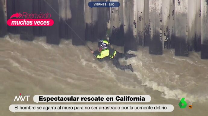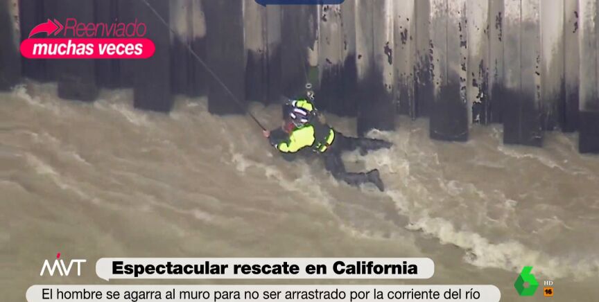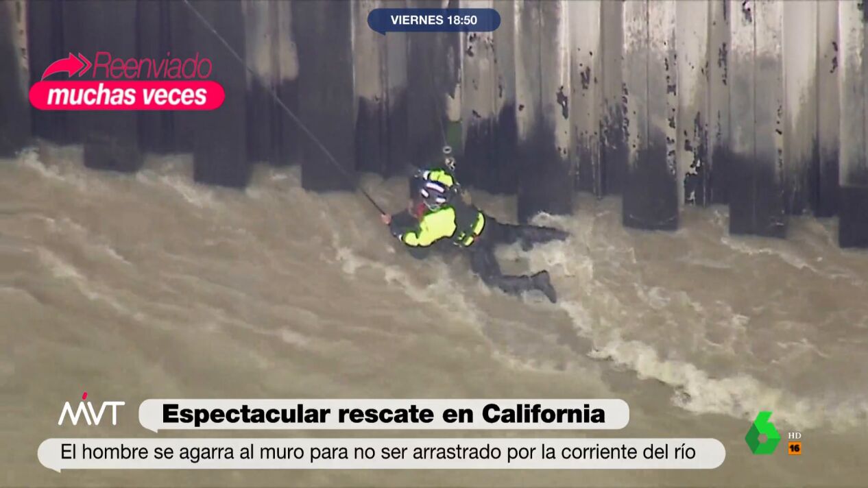 Las fuertes lluvias caídas durante los últimos días en California han provocado el desbordamiento de ríos y canales. El programa Más Vale Tarde ha mostrado un impactante vídeo sobre el rescate de un hombre que se encontraba atrapado debido a la crecida del agua.