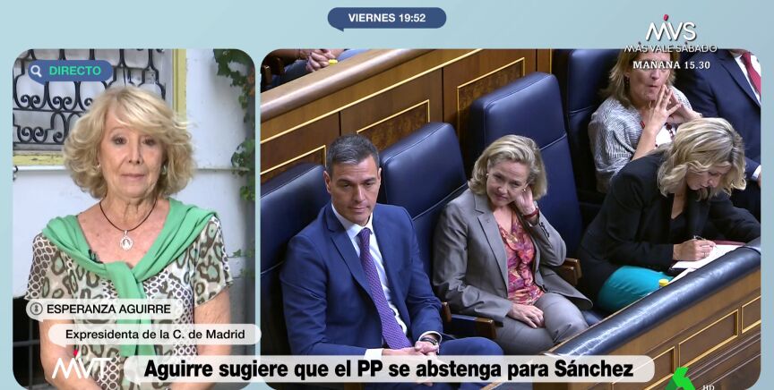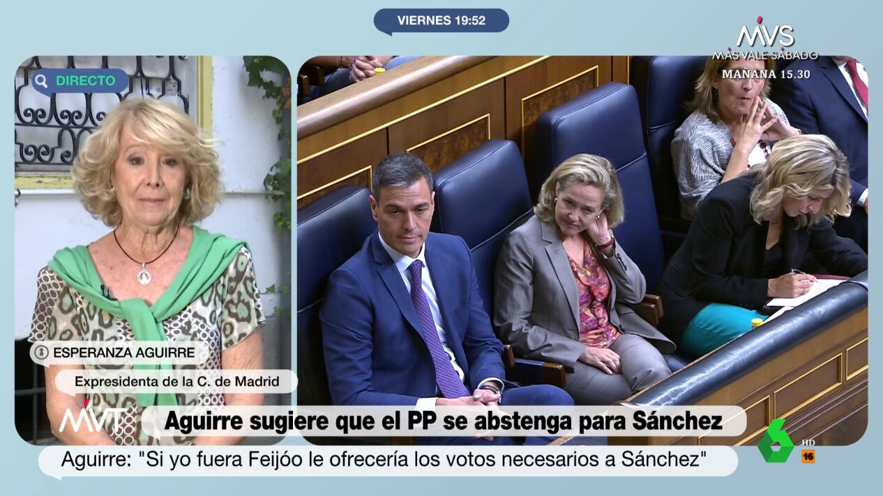 La expresidenta de la Comunidad de MadridEsperanza Aguirreha afirmado este viernes en Más Vale Tarde que si ella fuera Alberto Núñez Feijóo "ofrecería los votos que fueran necesarios" para que Pedro Sánchez "pudiera gobernar en solitario".
