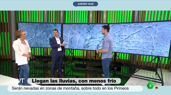 El meteorólogo explica que, de momento, solo hay lluvia en Galicia, el Cantábrico y norte de Navarra, si bien irán creciendo en las próximas horas. También habrá nieve en las zonas de montaña, sobre todo a partir de mañana y habrá subida de temperaturas tras los últimos días de heladas.