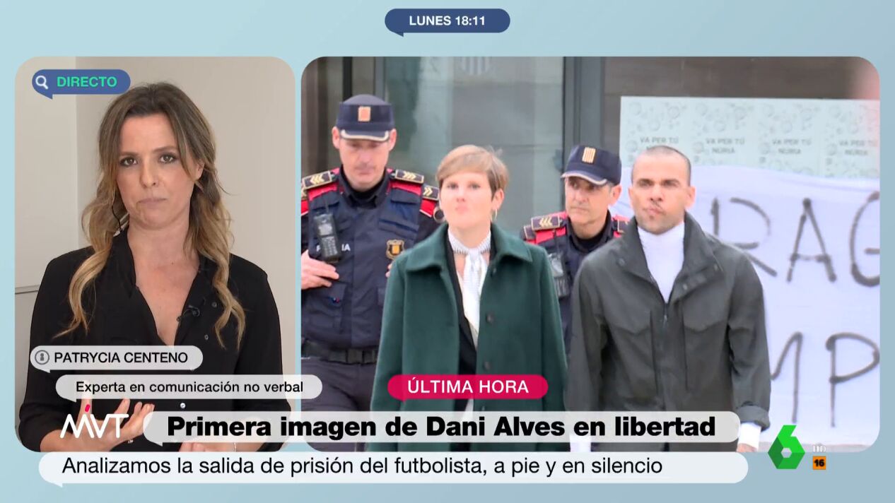 La experta en comunicación no verbal Patrycia Centeno analiza las imágenes de Dani Alves a la salida de prisión y explica qué es lo que dice con sus gestos y el atuendo escogido. "Transmite una actitud desafiante", asegura.