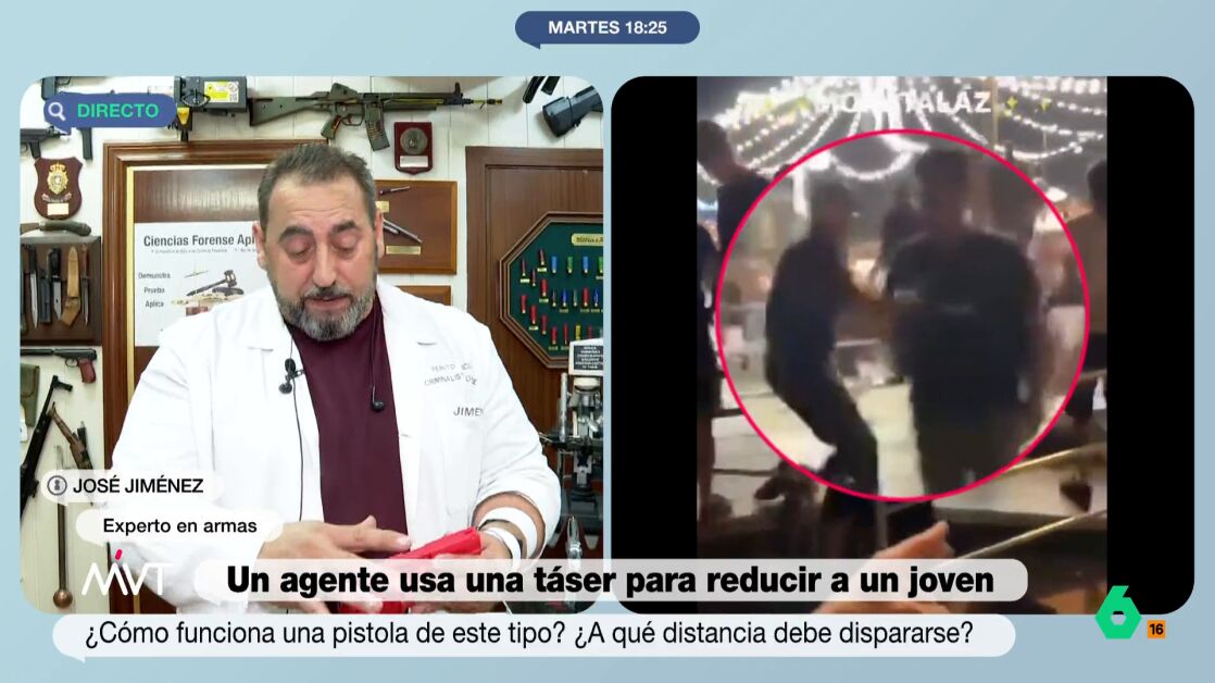 José Jiménez, experto en armas, ha explicado en Más Vale Tarde cómo se usa la pistola táser: "Lo que hace es que lanza mediante dos agujitas a una distancia máxima de siete metros con una cantidad de 2,1 miliamperios que lo que hace es una tetalización neuromuscular y capatizacion neuromuscular y dura 20 milisegundos".