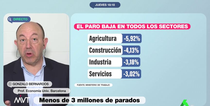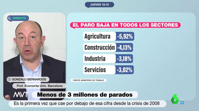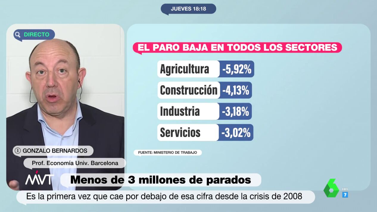 El economista Gonzalo Bernardos ha contrastado con datos las afirmaciones del líder de la oposición, Núñez Feijóo, tras analizar su primera reacción a la bajada del paro.