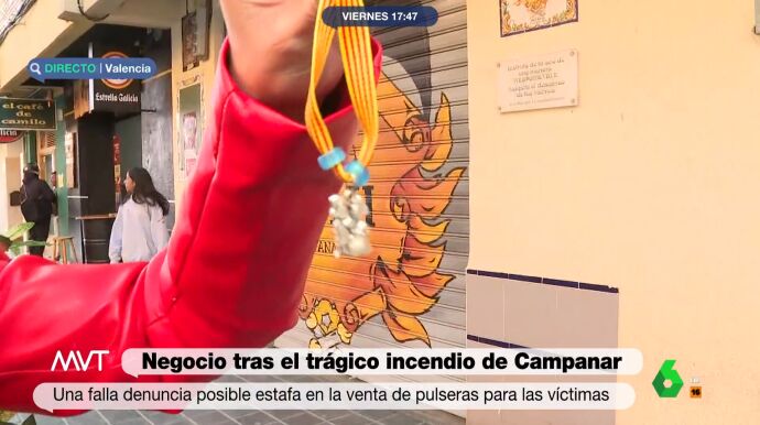 La mujer vendía la pulsera por 3 euros en diferentes establecimientos. Los trabajadores de la zona han contado a laSexta que una mujer se ha acercado a tiendas y peluquerías para contarles que vendía una pulsera con beneficio para las víctimas del trágico incendio de Valencia. Uno de ellos ha reconocido comprar una sin saber que era una estafa. La falla ya lo ha denunciado a la Policía Nacional.