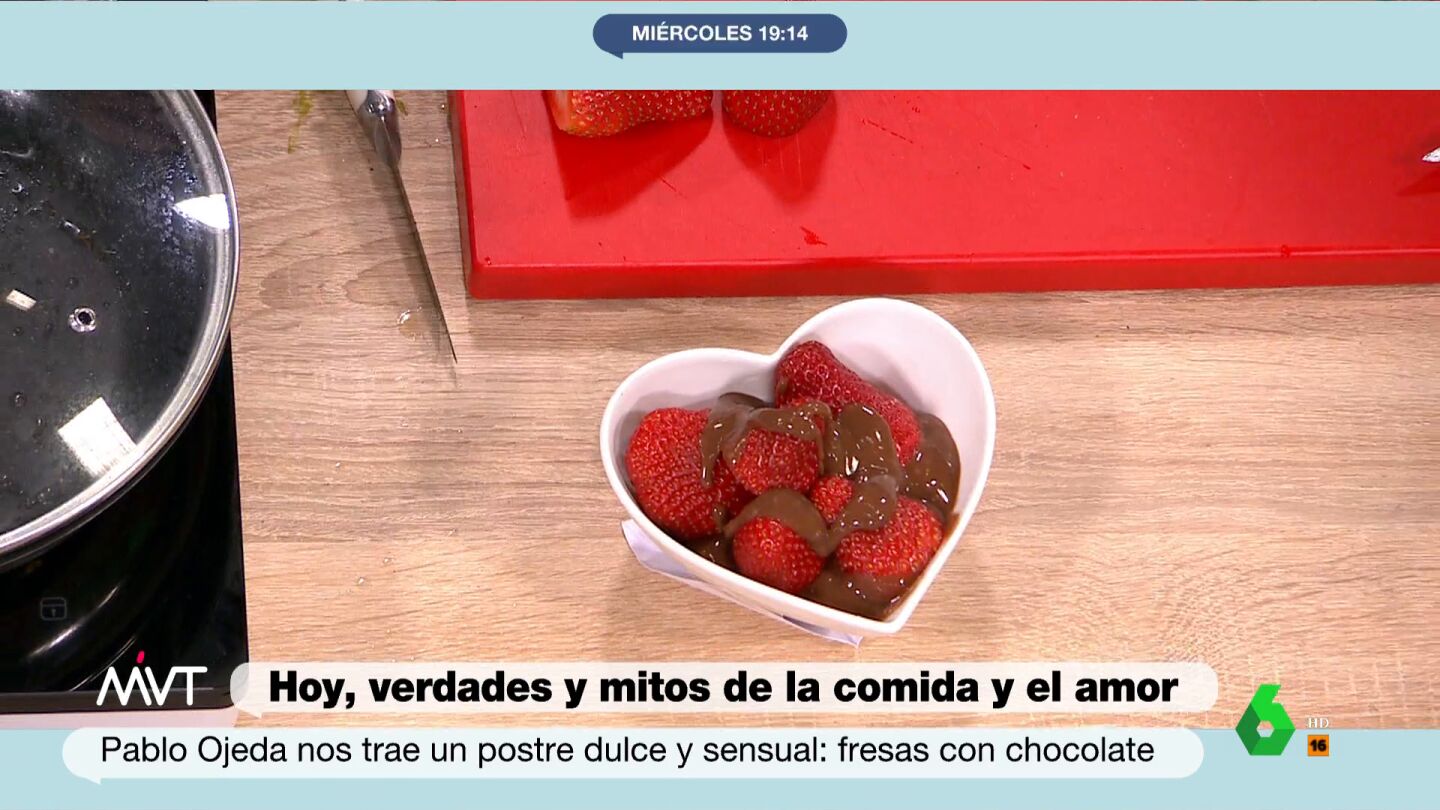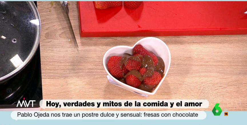 Pablo Ojeda prepara en Más Vale Tarde un delicioso postre "casero, sano y muy dulce". Se trata del que a él, "personalmente", más le gusta. "Cogemos unas fresitas y le cortamos las hojas", señala, tras lo que indica que hay que coger "chocolate 80% cacao y derretirlo". Así, ya solo queda poner en un recipiente el chocolate, colocar unas fresas encima, poner más chocolate por encima y listo.