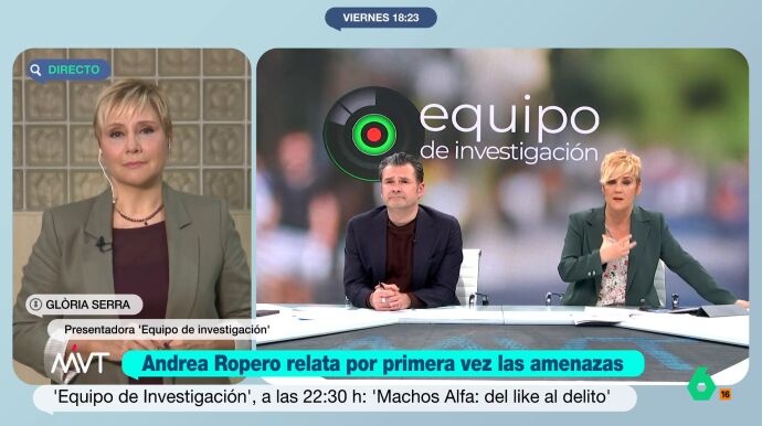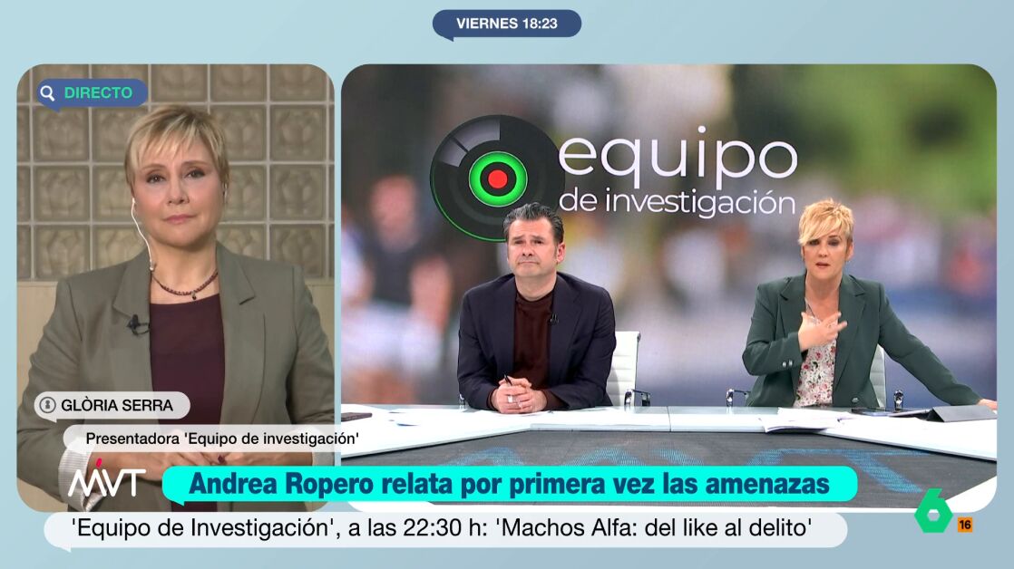 Gloria Serra ha desvelado detalles del programa de Equipo de Investigación 'Machos Alfa: del like al delito', y ha señalado que, precisamente, "ese el camino", en el que se pasa de un 'Me gusta' a cometer un acto ilegal. "Todo empieza con tipos que quieren sencillamente conseguir muchos 'likes' para ganar dinero, que ven aquí que hay un nicho, pero esto va escalando y se acaba creando una comunidad que se cree una manada", ha explicado la presentadora.