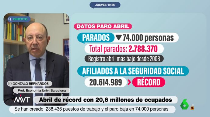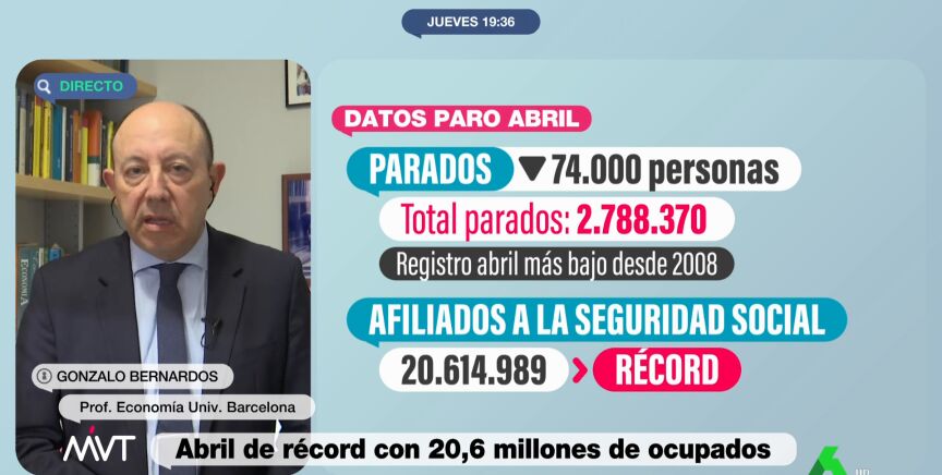 El paro ha bajado en abril, marcando el mejor en este mes de la serie histórica. Los datos, según ha explicado en Más Vale Tarde el economista Gonzalo Bernardos, son "espectaculares", y ha adelantado la "mejor noticia" del año.