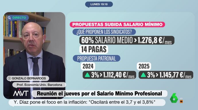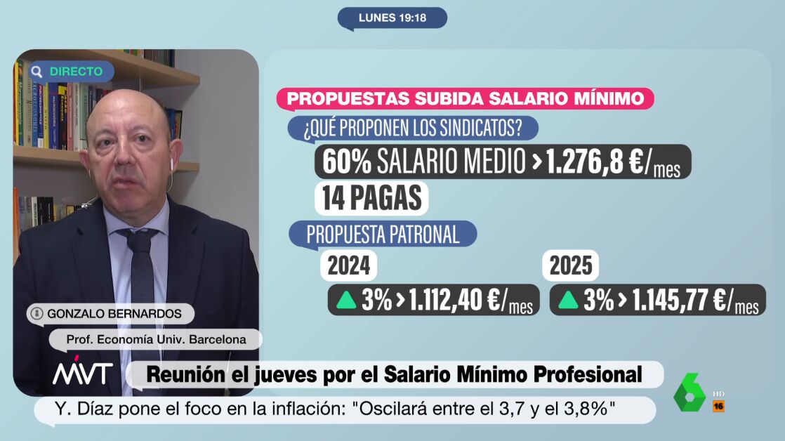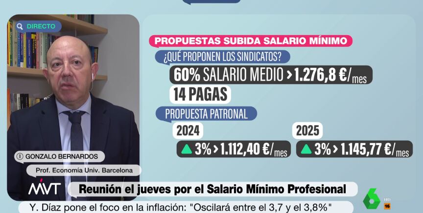 El economista Gonzalo Bernardos se decanta por "ofrecer racionalidad" al referirse a las propuestas de la patronal y los sindicatos para subir el salario mínimo interprofesional (SMI). Bernardos ve "lógico" que las familias "con menos posibilidades" puedan aumentar su poder adquisitivo.