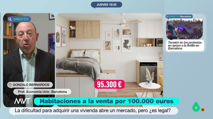 "La habitación, que es el porcentaje de un piso, sale carísima", expone. El economista considera que este tipo de ventas está más orientada a personas que especulan con el mercado inmobiliario. Bernardos indica que si se compra una habitación por 80.000 euros y que, después, se alquila la habitación por 700 euros al mes, "estoy obteniendo una rentabilidad muy interesante". Gonzalo añade que "es un chollo en comparación con lo que sería una vivienda tradicional". "Lo próximo será alquilar el hueco de la escalera", concluye Iñaki López.