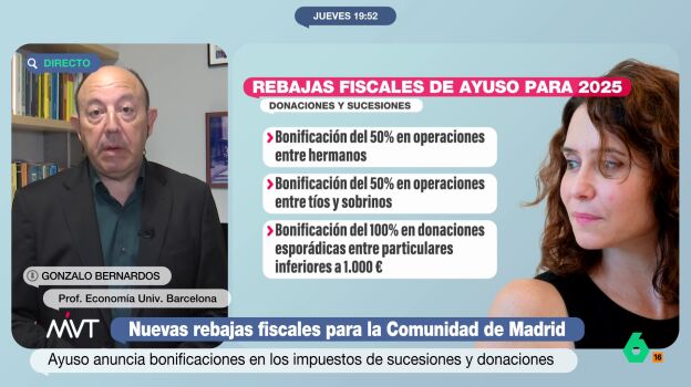 "Me parece que Díaz Ayuso no solo quiere que los ricos vengan a vivir a Madrid, sino pretende que aquellos ricos que no tengan hijos también vayan a morir, para que sus sobrinos o hermanos puedan tener una mayor herencia", sentencia el economista, si bien señala como acertada la decisión de la presidenta regional de fomentar la ocupación de lo municipios con menos de 2.000 habitantes.