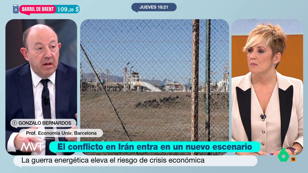 El conflicto de Irán ha entrado en un nuevo escenario y la guerra energética ha elevado el riesgo de crisis económica. Gonzalo Bernardos apunta que todavía no se puede hablar de crisis económica como tal, "pero tienes asegurado, si continuan los destrozos en instalaciones petrolíferas, es una reducción de la oferta de gas natural y de petróleo, y, por tanto, precios muy elevados".