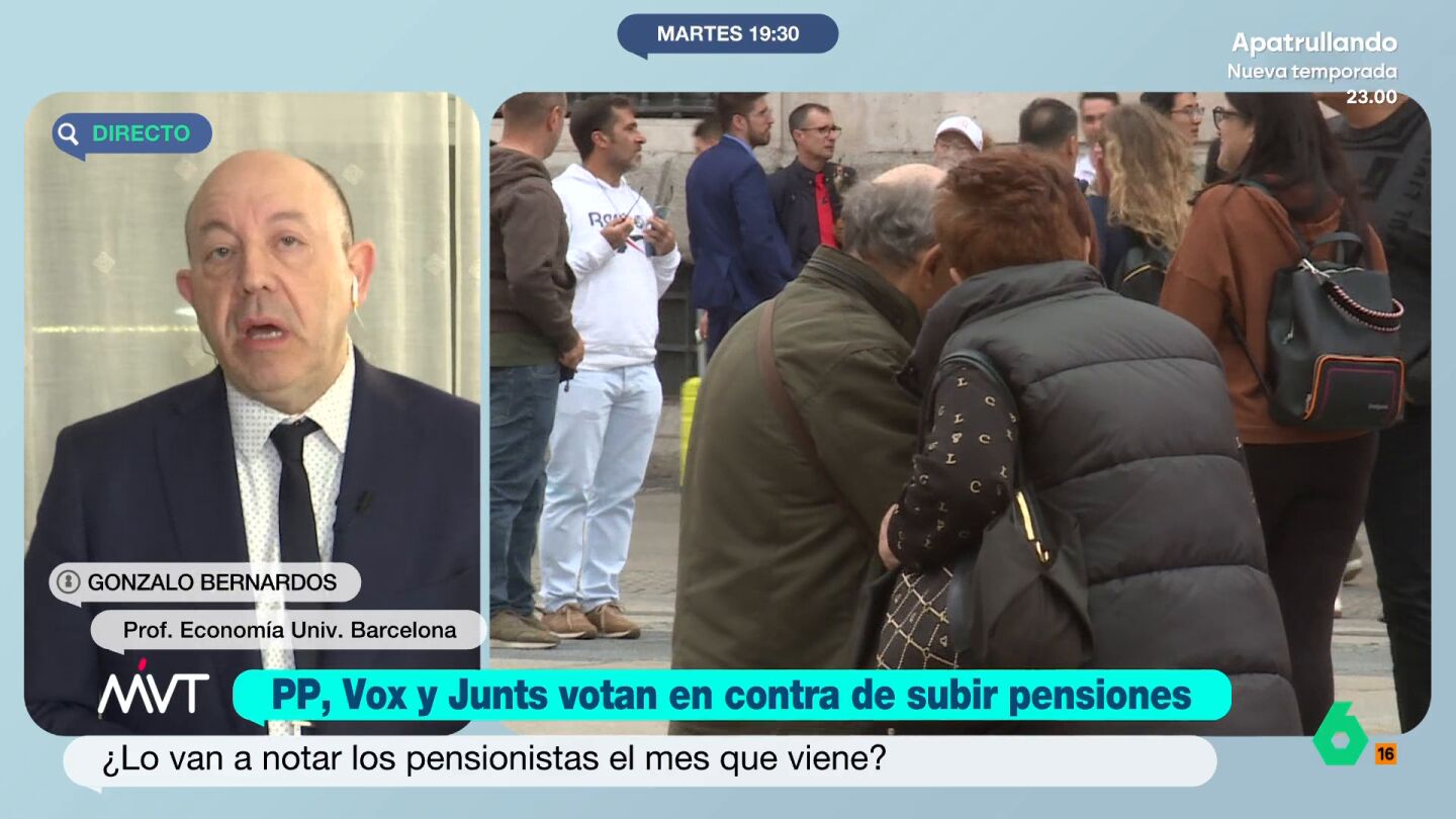 Iñaki López cree que va a haber una pronta subida de las pensiones, que los jubilados ya han cobrado este mes. "Tarde lo que tarde esto en aprobarse, lo van a cobrar y con retroactividad", indica el presentador. El economista expone que está asegurado que a la mayoría de los pensionistas les suban un 2,7%, "y también, muy probablemente, a alguno de los que menos cobran puedan llegar a subirles a hasta el 11,4%", indica. "Cuando vemos estas dificultades que tiene el gobierno, hay que pensar que no las tendría si tuviera Presupuestos", añade Bernardos.