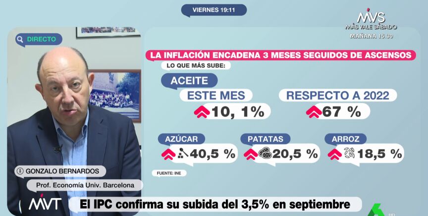 Gonzalo Bernardos, profesor de Economía de la Universidad de Barcelona, ha advertido en Más Vale Tarde de que el dato de la inflación "engaña". "Para saber si la tasa de inflación de un ejercicio ha sido buena o mala, tenemos que remontarnos al año pasado. Vemos que en septiembre del 2022 la inflación bajó 0,7 puntos. Por lo tanto, de los 0,9 que ha subido en septiembre, que nos ha hecho pasar del 2,6 al 3,5, 0,9 es efecto comparación con el año pasado, y solo 0,2 de subida de precios durante este mes", ha destacado el profesor.