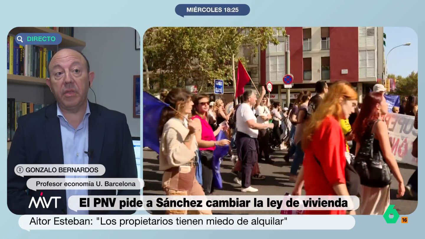 El profesor de Economía de la Universidad de Barcelona Gonzalo Bernardos ha opinado sobre las últimas manifestaciones contra el precio del alquiler y sobre un posible cambio en la política de vivienda del Gobierno. Bernardos ha asegurado que el Ejecutivo "la cambiará a peor".