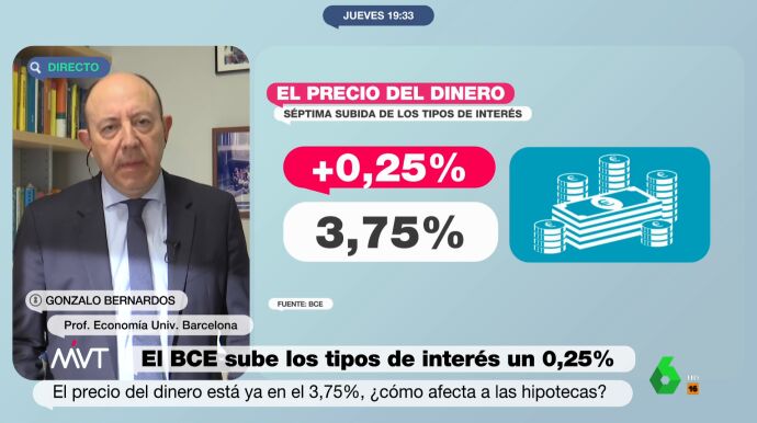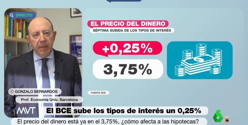 El Banco Central Europeo (BCE) ha subido este jueves los tipos de interés un cuarto de punto, hasta el 3,75 %. El economista Gonzalo Bernardos considera esta decisión un error. Según ha señalado este jueves en Más Vale Tarde, el BCE "es muy malo, se equivoca siempre".