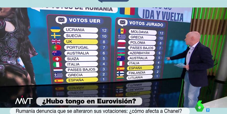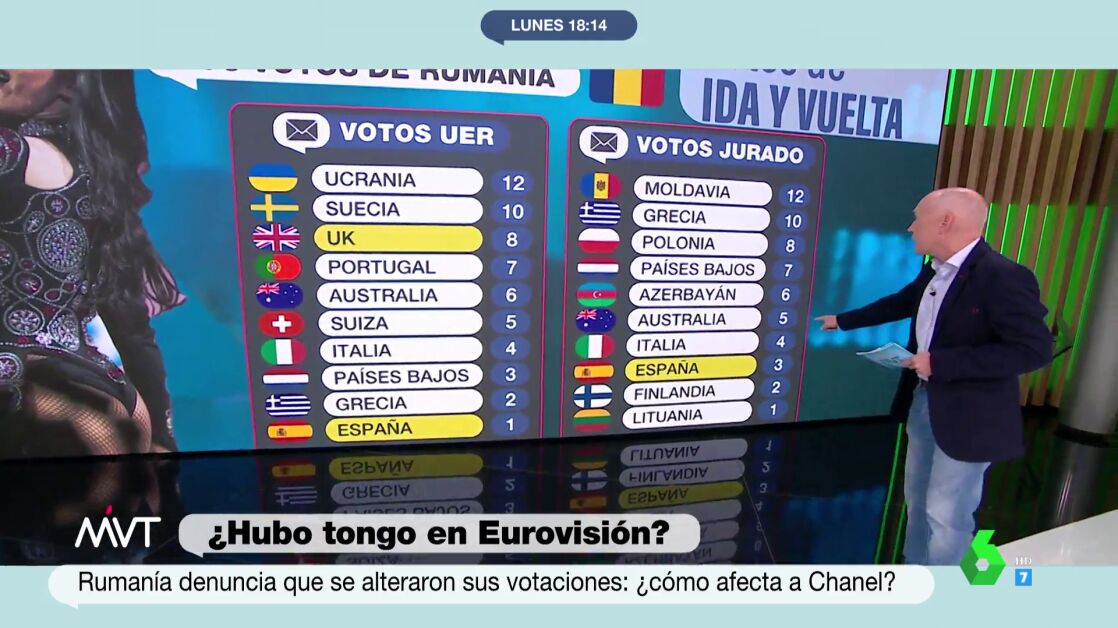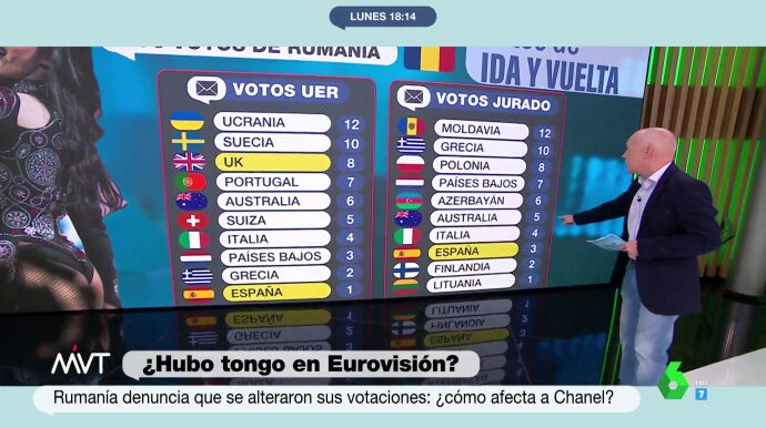 En este contexto, el programa ha contado también con los datos que aporta el periodista Luis Sanabria. Este explica que el voto del jurado lo dan 40 televisiones de todo el mundo, la mayoría de ellas son europeas. Estos votos los comunica un portavoz del jurado desde su respectiva ciudad, pero en el caso de Rumanía se dio por el "notario" del certamen, desde el escenario de Turín.