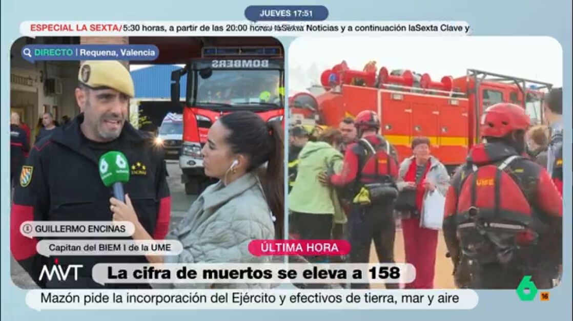 Más Vale Tarde habla, en directo, con Guillermo Encinas, capitán del BIEM I de la UME y desplazado para enfrentarse a los desperfectos provocados por la DANA en Requena y Utiel. "Tenemos 170 efectivos desplegados", informa a la periodista Marina Valdés, desplazada a la Comunidad Valenciana para informar sobre los efectos de la DANA.