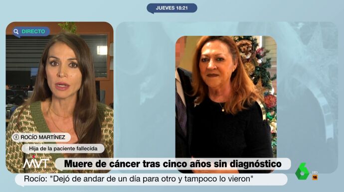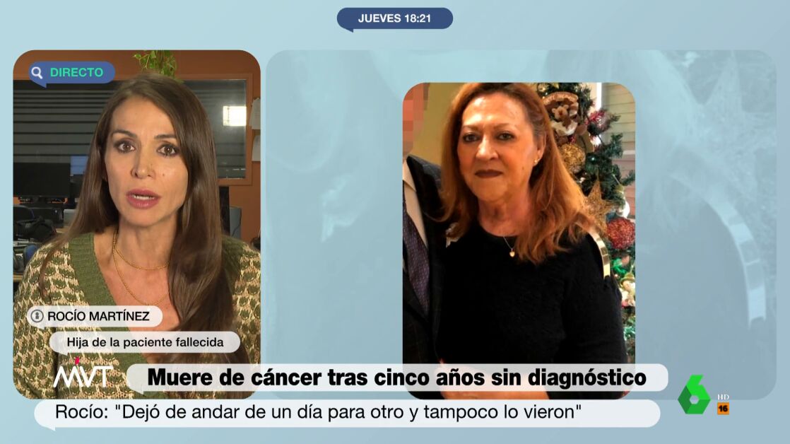 En ninguna de sus visitas se pidieron ni análisis de heces, ni colonoscopia ni analíticas con marcadores tumorales. Ahora, su hija, Rocío Martínez, ha denunciado su caso en Más Vale Tarde: "A mi madre la han tratado con profundo desprecio amparándose en el paraguas de la salud mental. Ha ido peregrinando por múltiples centros hospitalarios sin que nadie se haya parado a realizarle una prueba diagnóstica, a pesar de que refería ese dolor insoportable entre llantos, temblores, sudor... mi madre dejó de caminar de un día para otro, se quedó postrada en la cama. De ser una persona independiente pasó a ser rotundamente dependiente, pero eso no les hizo despertar las alarmas".