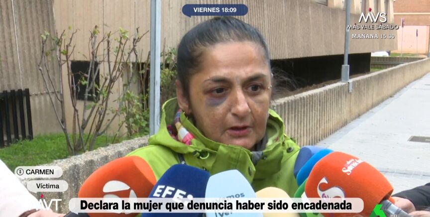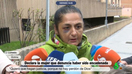 Carmen, la mujer que presuntamente fue secuestrada y encadenada por un hombre en Miranda de Ebro, ha hablado ante los medios y ha señalado que va a pedir medidas de protección. "Quiero que lo castiguen, que hagan justicia, porque lo que ha hecho ese hombre conmigo no tiene perdón de Dios", ha manifestado, tras lo que ha contado que "ahora mismo" no tiene miedo.