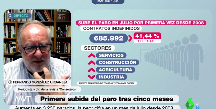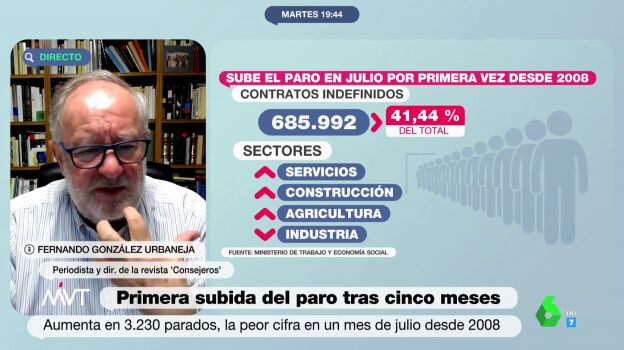 Preguntado por los últimos datos económicos del paro, con una subida en julio, y de ventas de coches, que fueron negativos, Urbaneja señala que en tendencia la creación de empleo es "buena" aunque faltan 2,5 millones de empleos adicionales para "ser una economía en pleno potencial". Y por el descenso en la venta, lo achaca a un problema en la oferta, ya que no hay suficientes coches para cubrir la demanda.