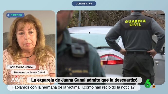 Ana María, hermana de Juana Canal, se siente "llena de dolor y de rabia" tras saber que la expareja de su hermana la descuartizó, según él mismo ha confesado. El detenido, sin embargo, sostiene que se la encontró muerta, una versión que Ana María pide no creer en Más Vale Tarde.