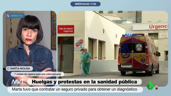 Marta sufría mucho dolor y complicaciones en el intestino y el colón, pero tenía que esperar siete meses para la prueba que posiblemente desvelase qué es lo que le pasaba. No pudo esperar más y recurrió a la sanidad privada, donde le diagnosticaron un cáncer. Ahora cuenta su historia para denunciar el estado de nuestra sanidad y lo que pacientes como ella están viviendo.