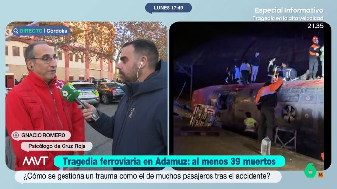 Tras la tragedia ferroviaria ocurrida en Adamuz, Córdoba, Más Vale Tarde conecta con Ignacio Romero, psicólogo de Cruz Roja, que se encuentra en Córdoba junto a Javier Bastida. El reportero pregunta al profesional si es peor gestionar la incertidumbre o el momento en el que ya se conoce qué ha ocurrido con un familiar.