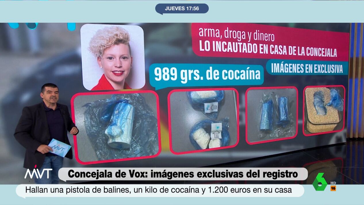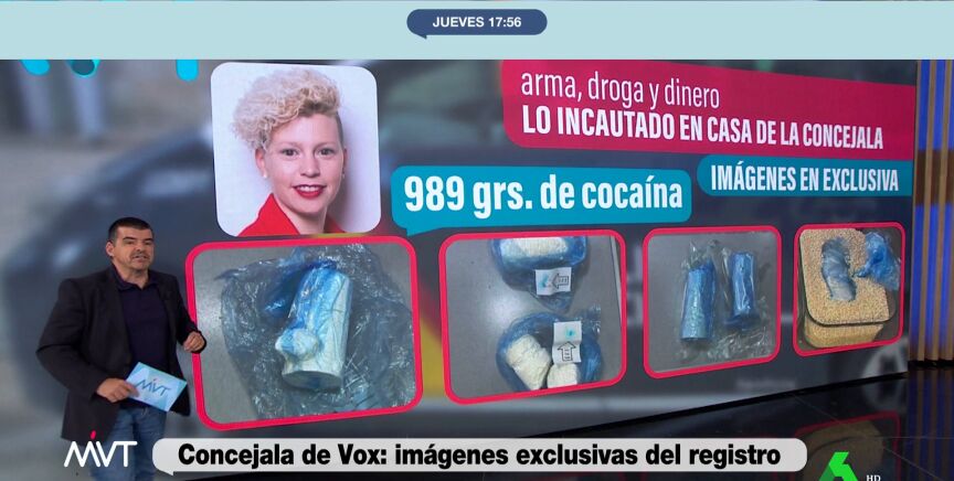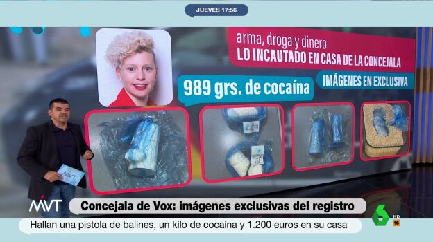 laSexta ha accedido en exclusiva a las imágenes del registro de la policía en la casa de Ana González Martínez, la concejala de Vox en Parla detenida después de que hallaran una pistola de balines, un kilo de cocaína y 1.200 euros en su casa en Yeles, Toledo.