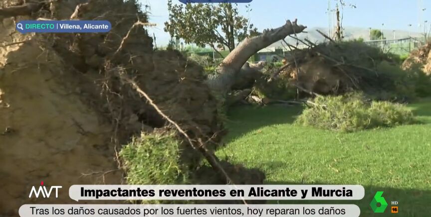 El reventón térmico seco que se ha producido este martes en las provincias de Alicante y Murcia ha afectado especialmente a la ciudad de Villena, donde el fuerte viento arrancó hasta 16 árboles de más de 25 metros de longitud y tronco de gran diámetro en unas instalaciones deportivas. No hubo heridos, según el Consorcio Provincial de Bomberos de Alicante.