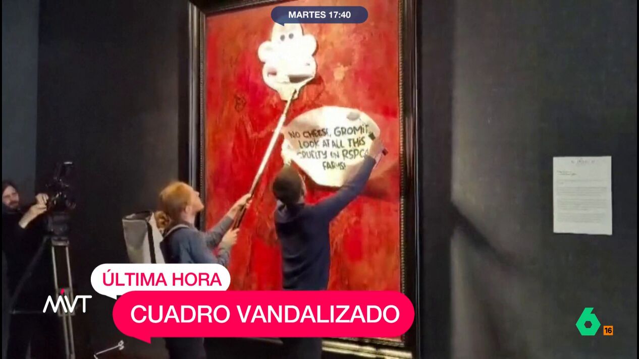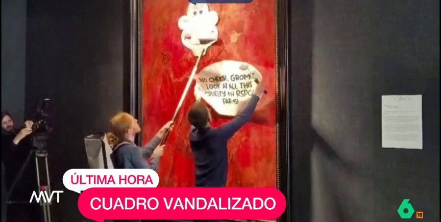 Dos activistas del grupo Animal Raising han vandalizado el cuadro del rey Carlos de Inglaterra y han cubierto el rostro del monarca con un póster del personaje del hombre de Wallace y Gromit.