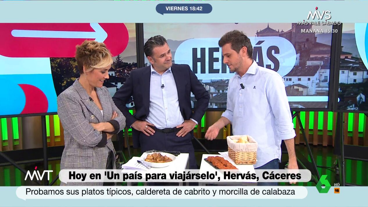 El presentador de Más Vale Tarde cae rendido a los encantos gastronómicos de Hervás (Cáceres). Prueba una caldereta de cabrito y morcilla de calabaza y sentencia: "Solo porque dan esto, como si Hervás fuera un cementerio nuclear. Ya por esto hay que ir a Hervás".