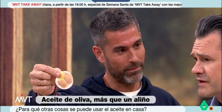 Ojeda ha impregnado ese algodón con aceite de oliva y, seguidamente, se ha frotado la frente con el mismo. Al mostrarlo ante la cámara se ha visto como este estaba manchado de maquillaje. "Me está hidratando y, sobre todo, desmaquillando", expone el nutricionista. "Otras, que limpia... es un gran desmaquillante", afirma, sorprendido, Iñaki. "Casi lo prefiero en su formato de escabeche", comenta el presentador.