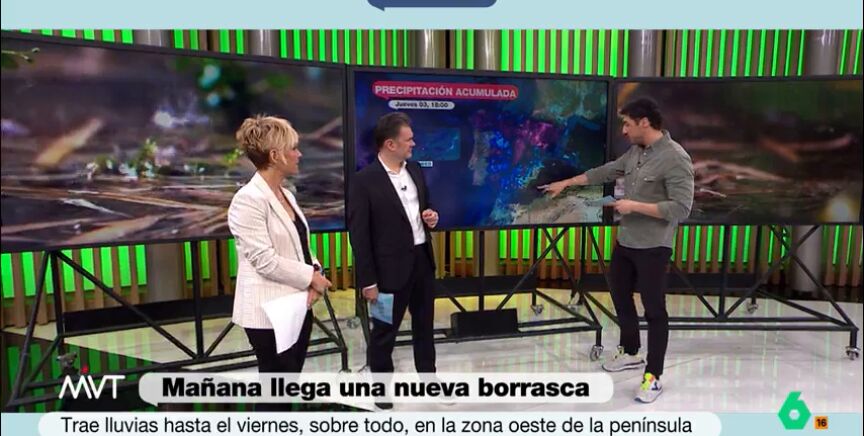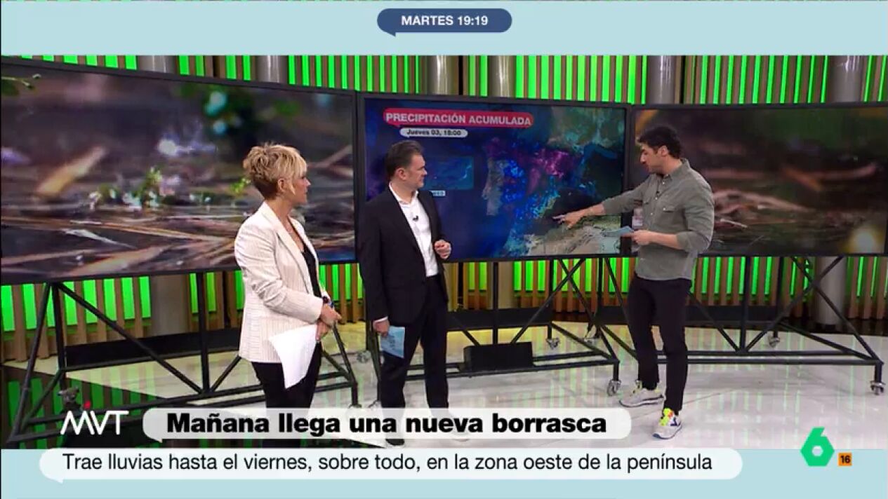"Solo te equivocas para dar malas noticias", apunta López. "El fin de semana podría haber coletazos de la misma borrasca pero, en principio, lo gordo será hasta el viernes", resume Cristina Pardo. "¿El fin de semana podemos librar?", pregunta el presentador. "El fin de semana todavía podría quedar algún chubasco pero no van a ser lluvias tan fuertes", responde el meteorólogo. "O sea sí, que va a llover", afirma López.