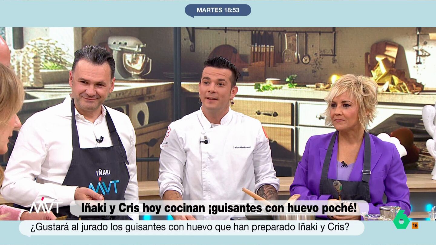 Gonzalo Miró se ha mostrado muy crítico con la receta que han elaborado hoy Cristina Pardo e Iñaki López. El chef Carlos Collado les ha enseñado cómo hacer unos guisantes con huevos poché. Una elaboración con un paso algo complejo: hacer el huevo escalfado.