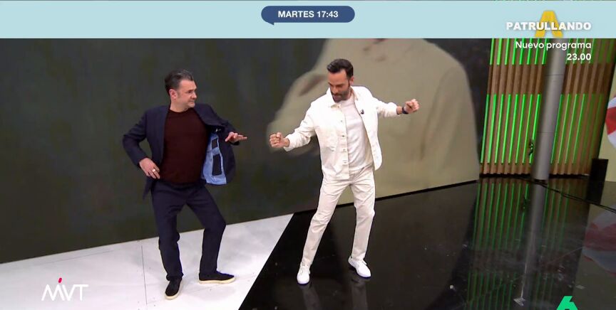 "Me están pidiendo mucho que baile y voy a empezar a sospechar por si acaso no lo estuviera haciendo bien", reacciona el presentador de Más Vale Tarde, mientras Torá le responde que "hay gente interesada" en que el presentador mueva "el esqueleto".