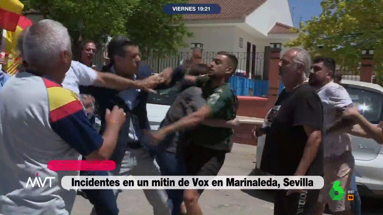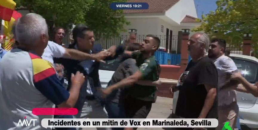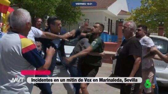 Como puede observarse en el vídeo superior se han vivido momentos de tensión, con intercambio de insultos, golpes y agresiones. El partido de ultraderecha había convocado un mitin frente al Ayuntamiento al mediodía de este viernes con la presencia del eurodiputado Jorge Buxadé. A la llegada del mismo, un grupo de vecinos ha comenzado a increparle. Según informa la Agencia Efe, los insultos se han reproducido desde las dos partes, con conductores que pasaban por la zona y les gritaban.
