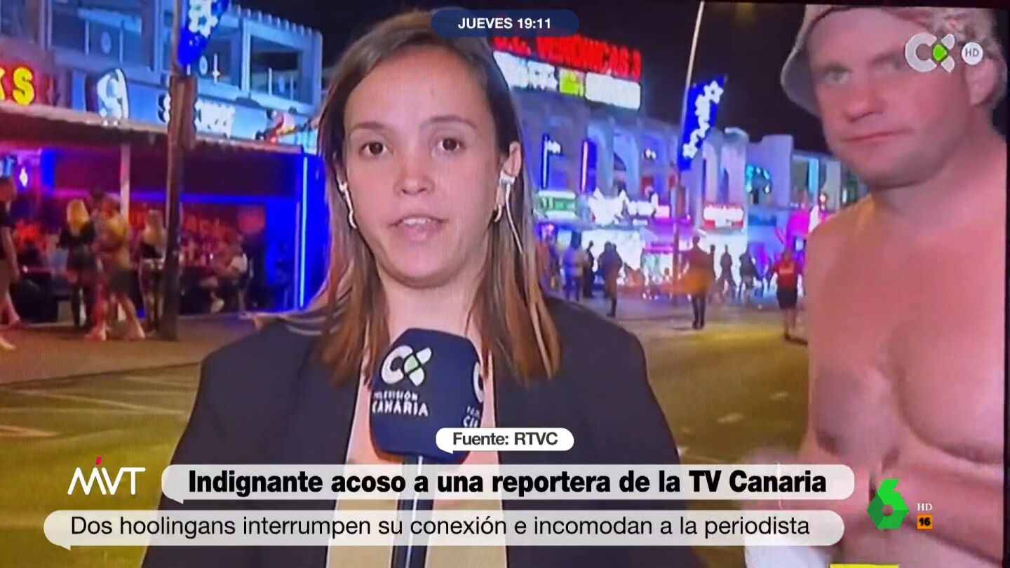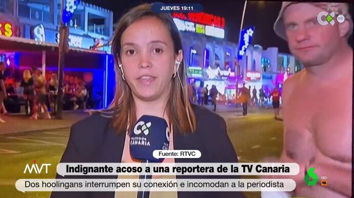La periodista tuvo que soportar a dos hooligans que se le acercaron a pocos centímetros mientras estaba haciendo una retransmisión para la Televisión Canaria.