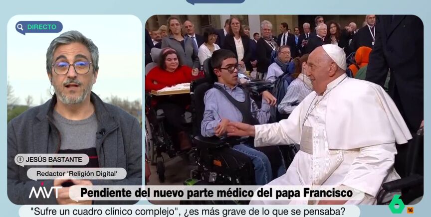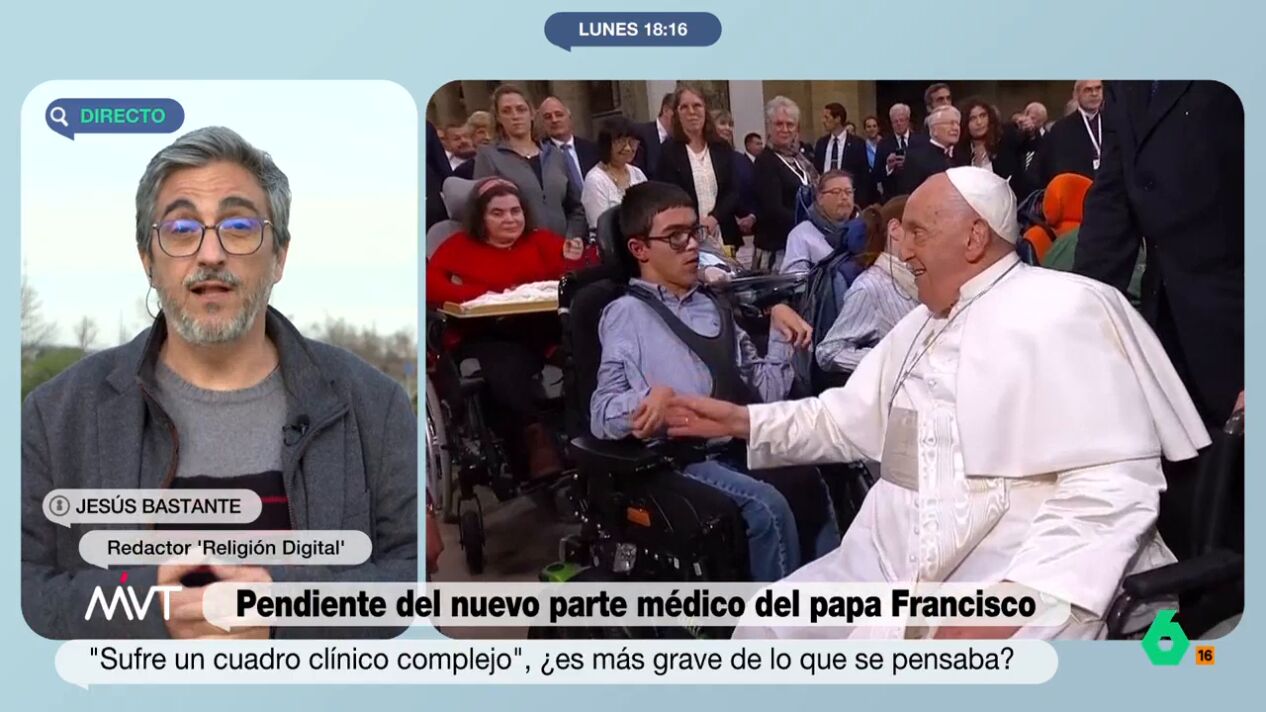 Jesús Bastante, redactor de 'Religión Digital', habla en Más Vale Tarde acerca de la hospitalización del papa Francisco y de su cuadro médico "complejo". Bastante prefiere alejarse de malos augurios y considera que no estamos "ante el último canto de Francisco".