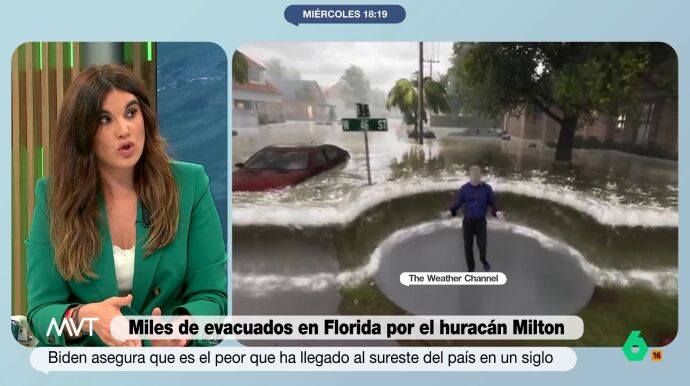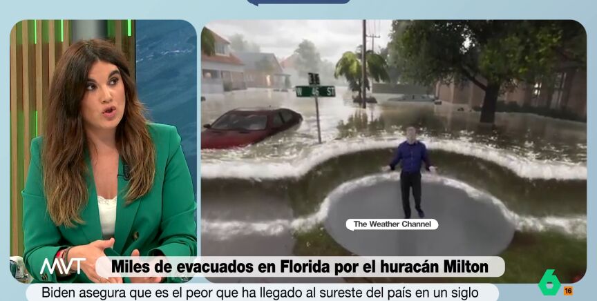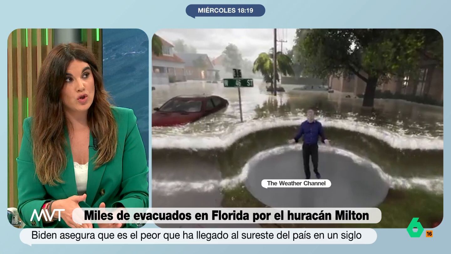 La meteoróloga Joanna Ivars González ha alertado sobre los peligros del huracán Milton que afecta Florida. "El tamaño del huracán es enorme.Va a afectar a toda la costa oeste de Florida. Y es del tamaño de florida, pero multiplicado a lo ancho por dos", ha explicado.