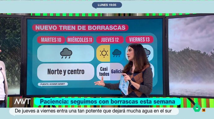 Para el fin de semana, la meteoróloga de laSexta adelantó buenas noticias. Según explicó, el sábado 14 entra un anticiclón que se mantendrá hasta el miércoles 18 de febrero. Este fenómeno "hará que suba la altitud y que dejen de entrar las borrascas", lo que permitirá un periodo de tiempo más estable y soleado.