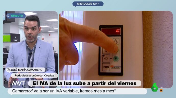 El periodista económico de Colpisa, José María Camarero, ha advertido en Más Vale Tarde de que a partir de ahora "va a ser un IVA variable, iremos mes a mes". "Ahora vamos a tener que estar pendientes de a cuánto ha estado el precio de la luz el último mes para saber si el mes siguiente sube o baja el IVA. Vamos a tener un IVA variable a lo largo de todo el año entre el 10 y el 21%,ue no es cuestión menor", ha comentado.