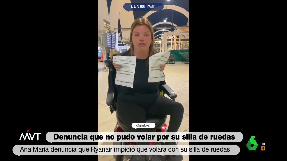 La joven ha explicado que le dieron dos alternativas: o no volar, o estropear la silla para poder hacerlo. Ana María ha indicado que esta última opción no era viable, ya que nadie le aseguraba que al llegar a Milán se la pudieran arreglar. "Esto son mis pies y mis manos, ¿cómo me voy a mover por Italia si no lo arreglan?", ha preguntado completamente indignada.